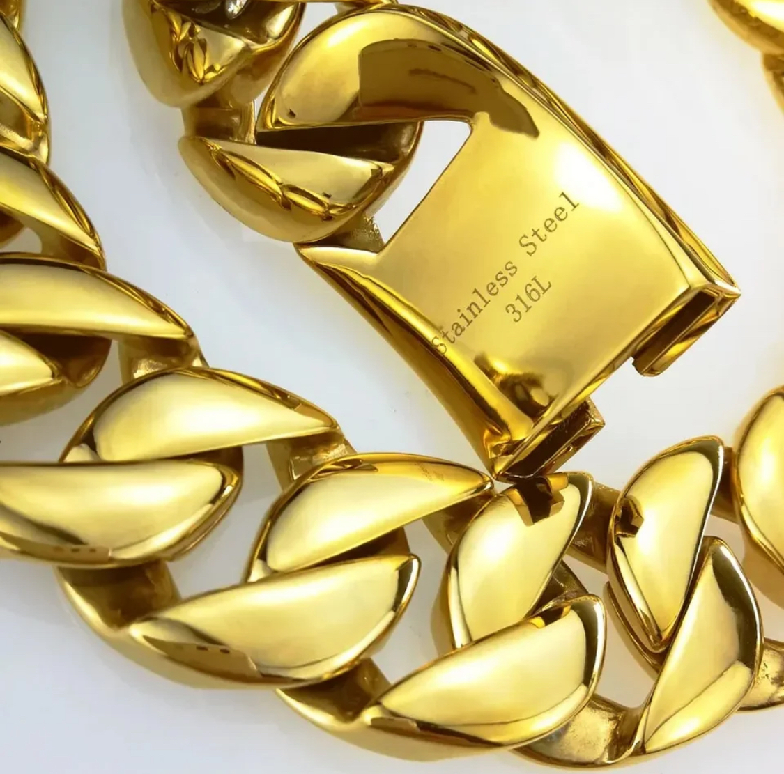 Stainless Steel, Gold Plated, will not tarnish, very heavy. Comes in 40cm, 45cm, 50cm and 55cm. Available in Gold and Silver. Please provide information in the notes section at checkout.